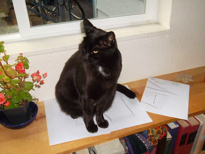 Of course, Starfire was going to sit on print-outs of my Etsy sewing pattern download. On this Caturday morning, my sweet sewing helper is essential to pattern assembly.